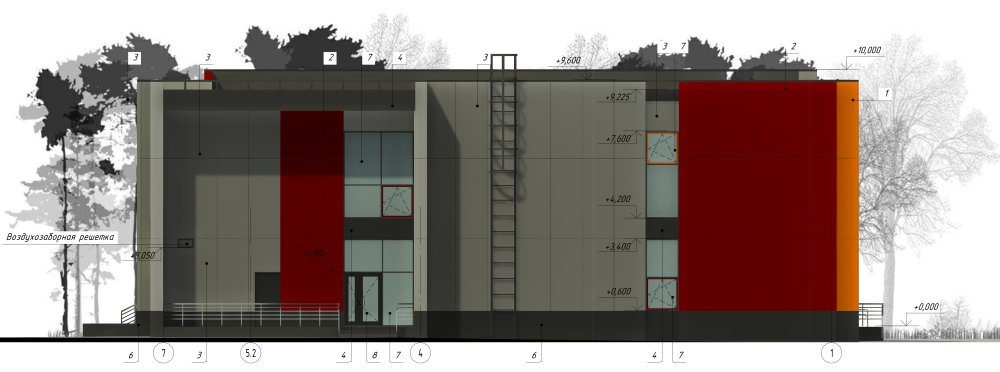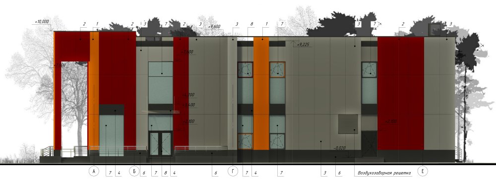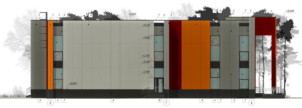 В качестве цветового акцента используются панели цветов RAL 2000 (желто-оранжевый), RAL 3003 (рубиново-красный), RAL 7021 (черно-серый), RAL 9003 (сигнальный белый). За основной цвет приняты панели цвета RAL 9002(светло-серый).
